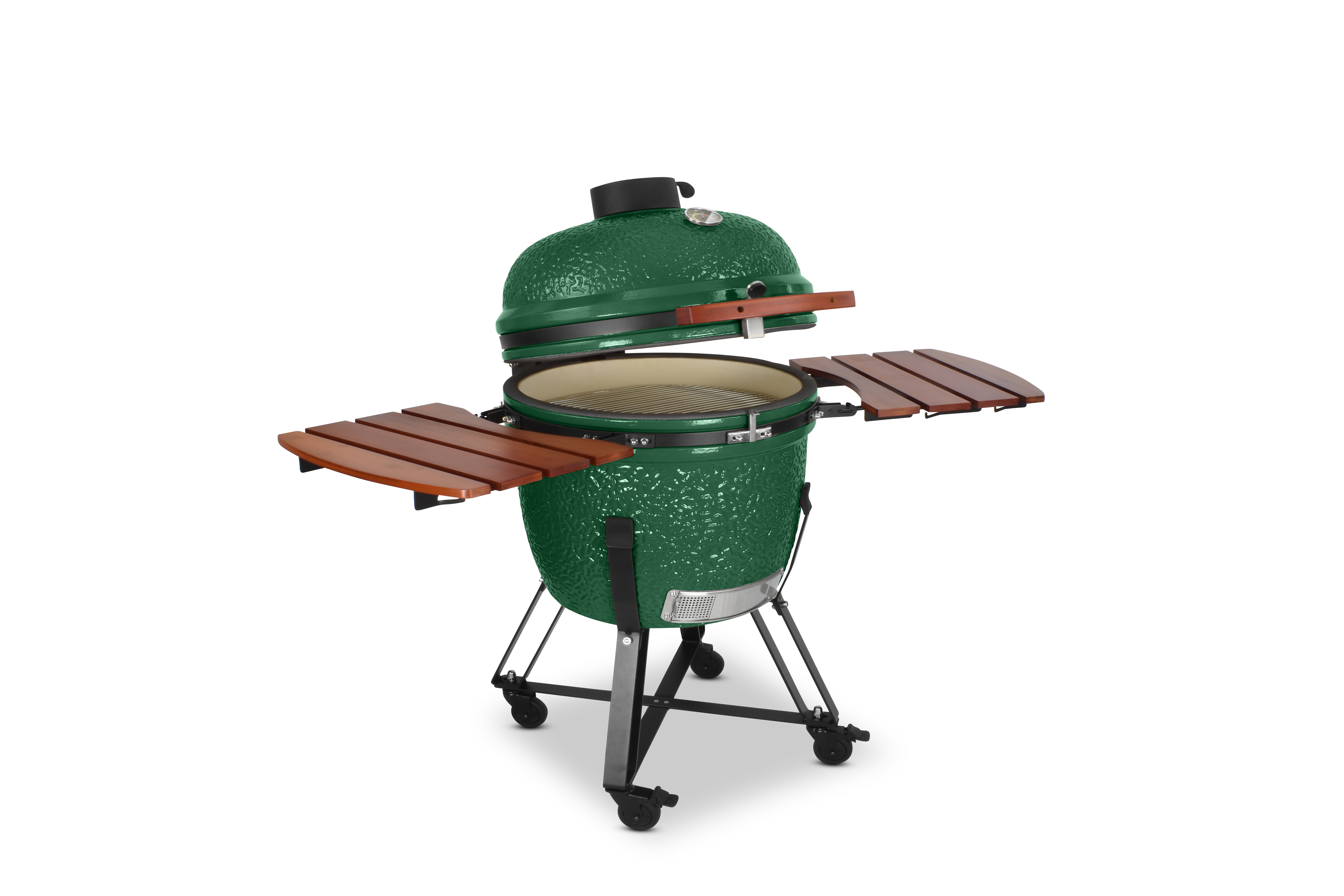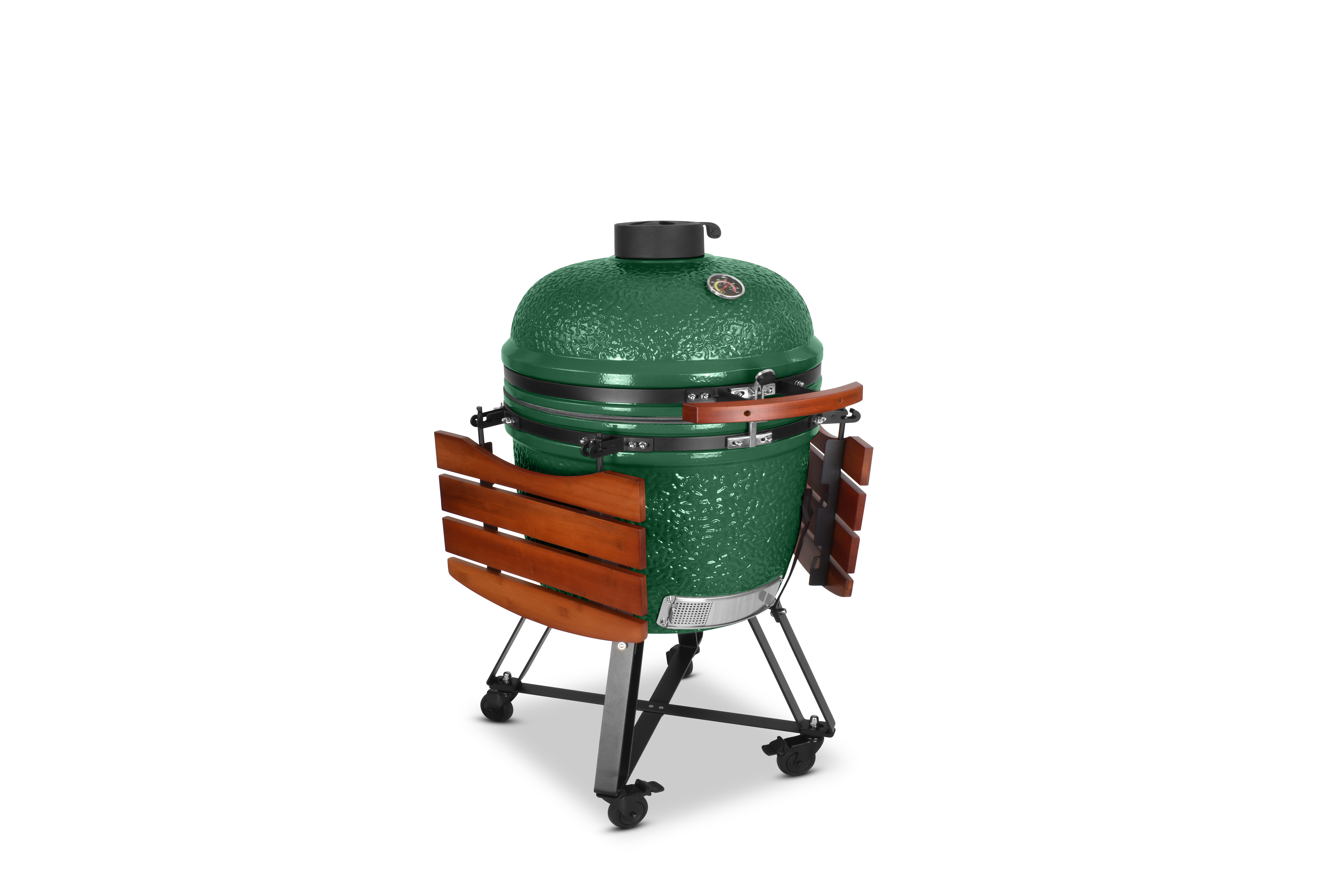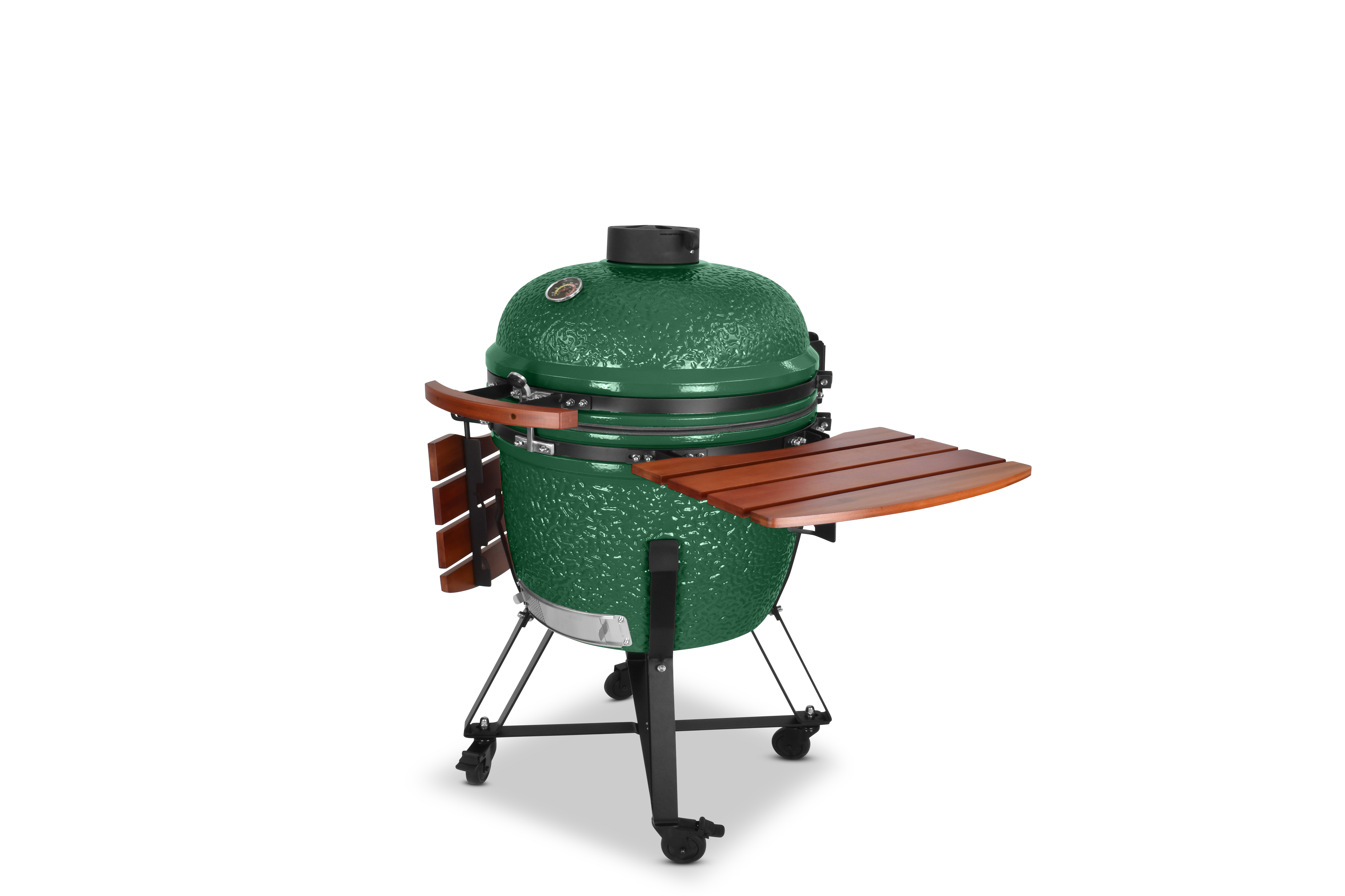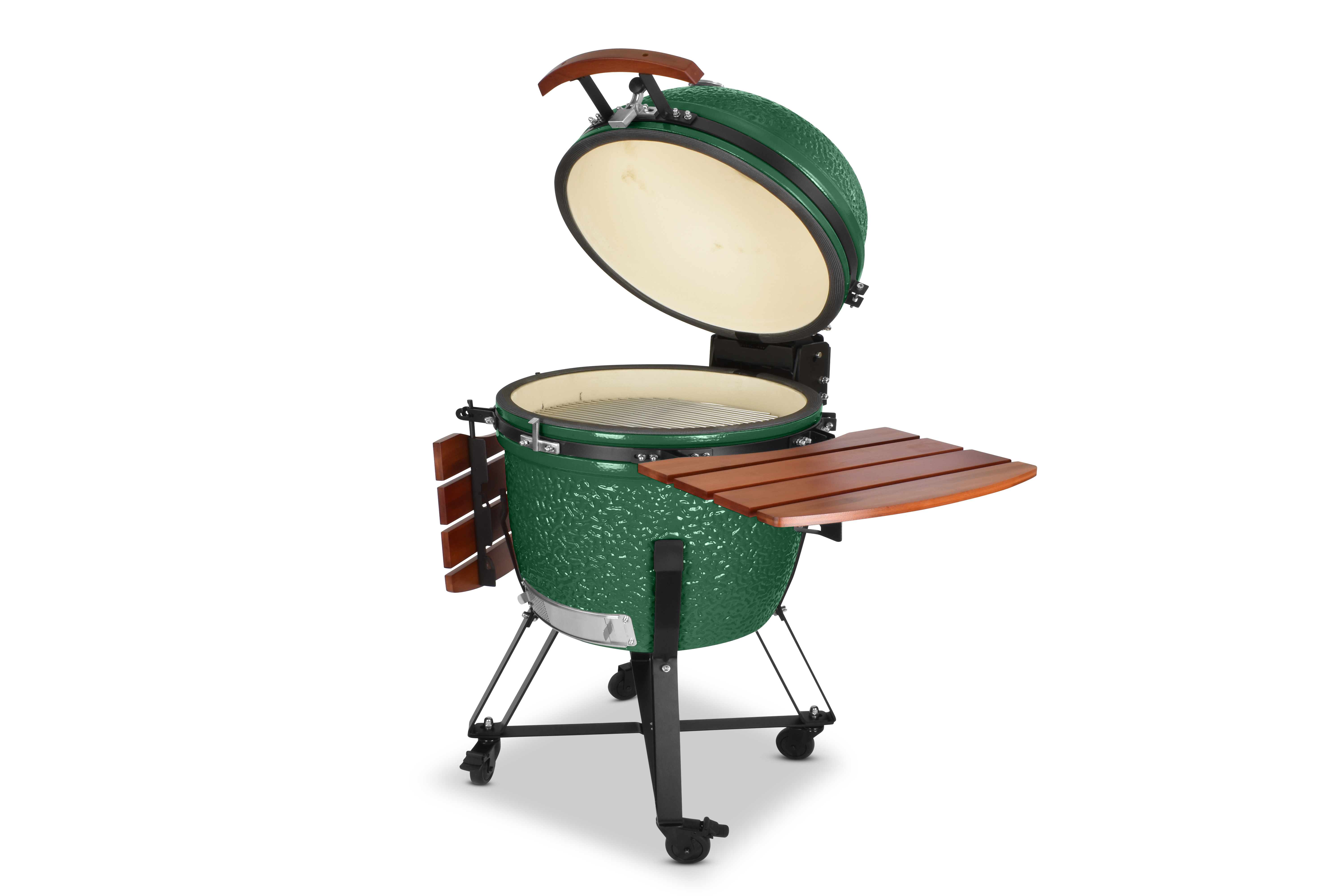 Damit es Ihnen an nichts fehlt, wird der Grill mit einem umfangreichen Zubehörpaket geliefert: Zwei einklappbare Ablagen aus Bambusholz links und rechts neben dem Grilldom bieten genügend Ablagefläche, damit sie immer wissen, wo Grillgut, Besteck oder Getränk ihren Platz finden. Sein Gestell bietet dem Kamado nicht nur einen sicheren Stand und hebt ihn in eine angenehme Arbeitshöhe, sondern ist auch mit vier Schwerlastrollen ausgestattet, um ihn mit wenig Mühe zu bewegen. Damit beim Grillen nichts rollt, besitzen zwei der Räder Feststellbremsen.