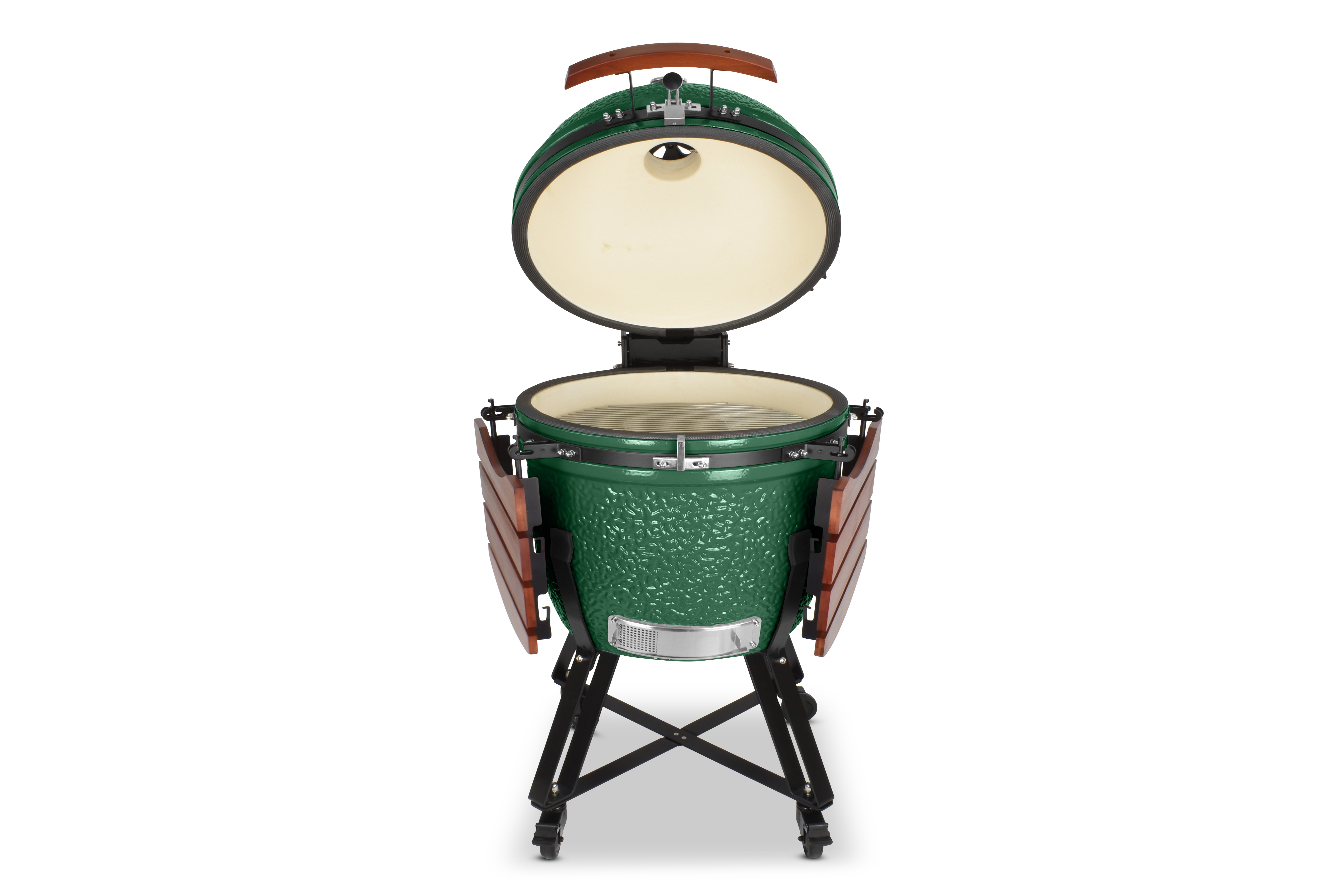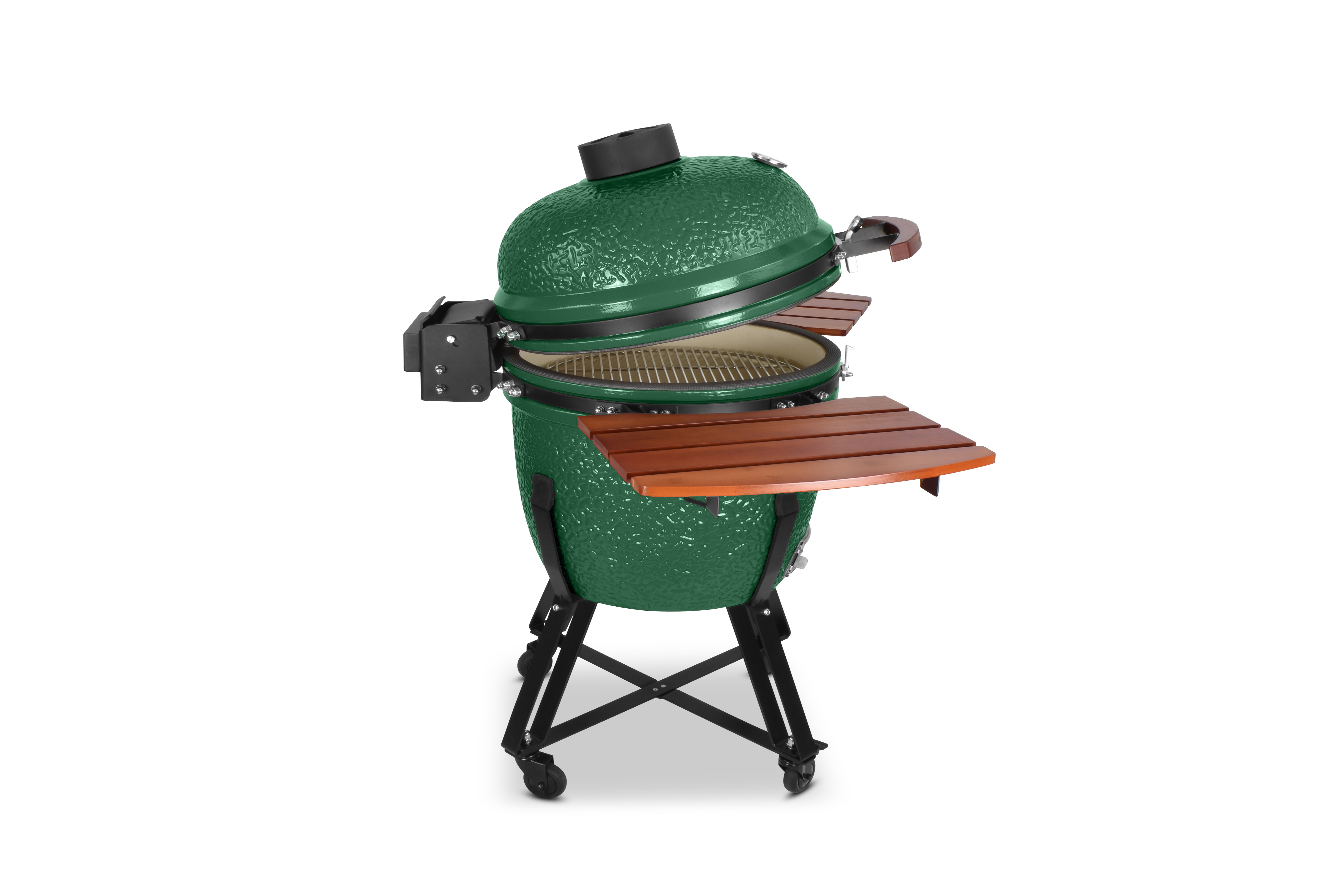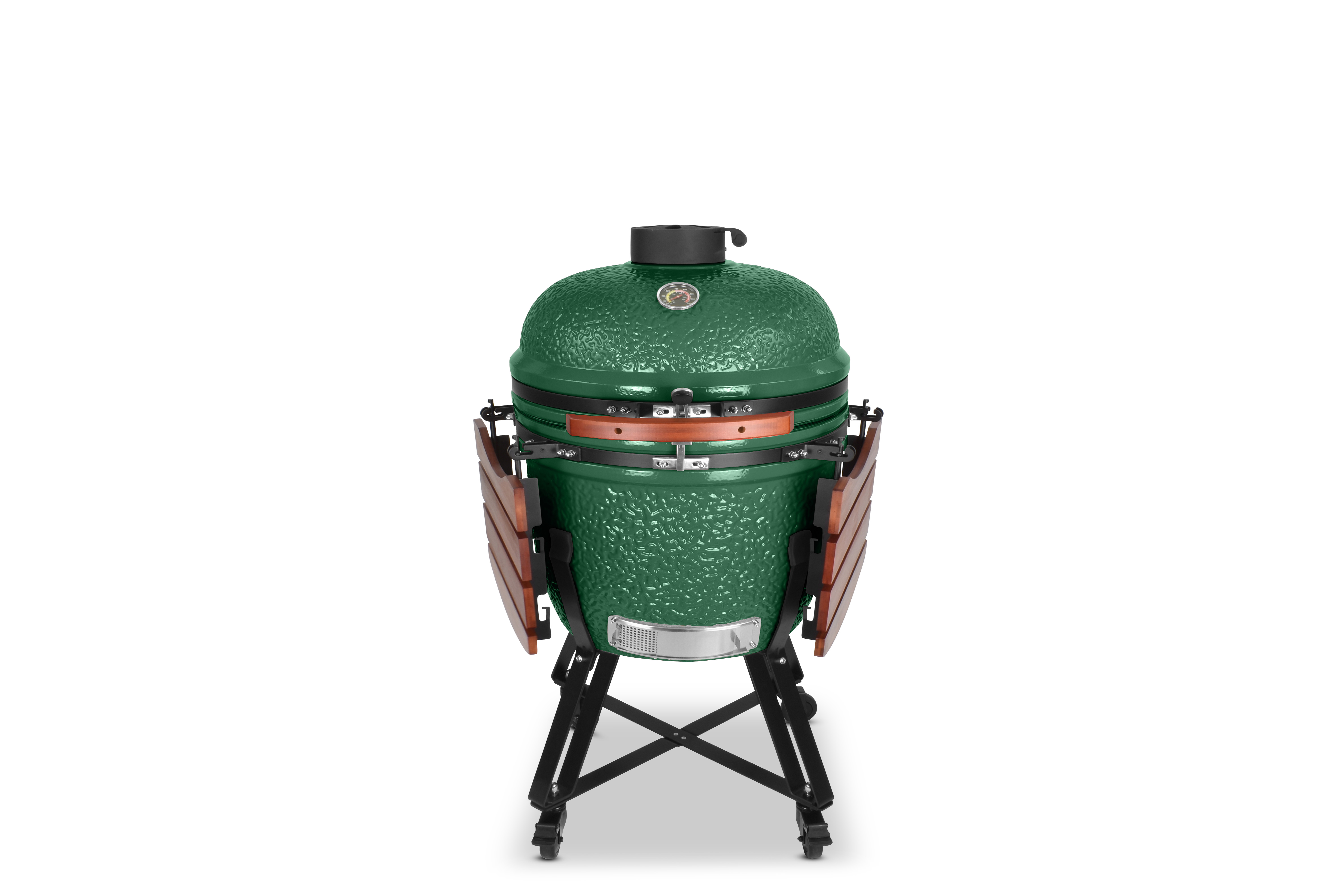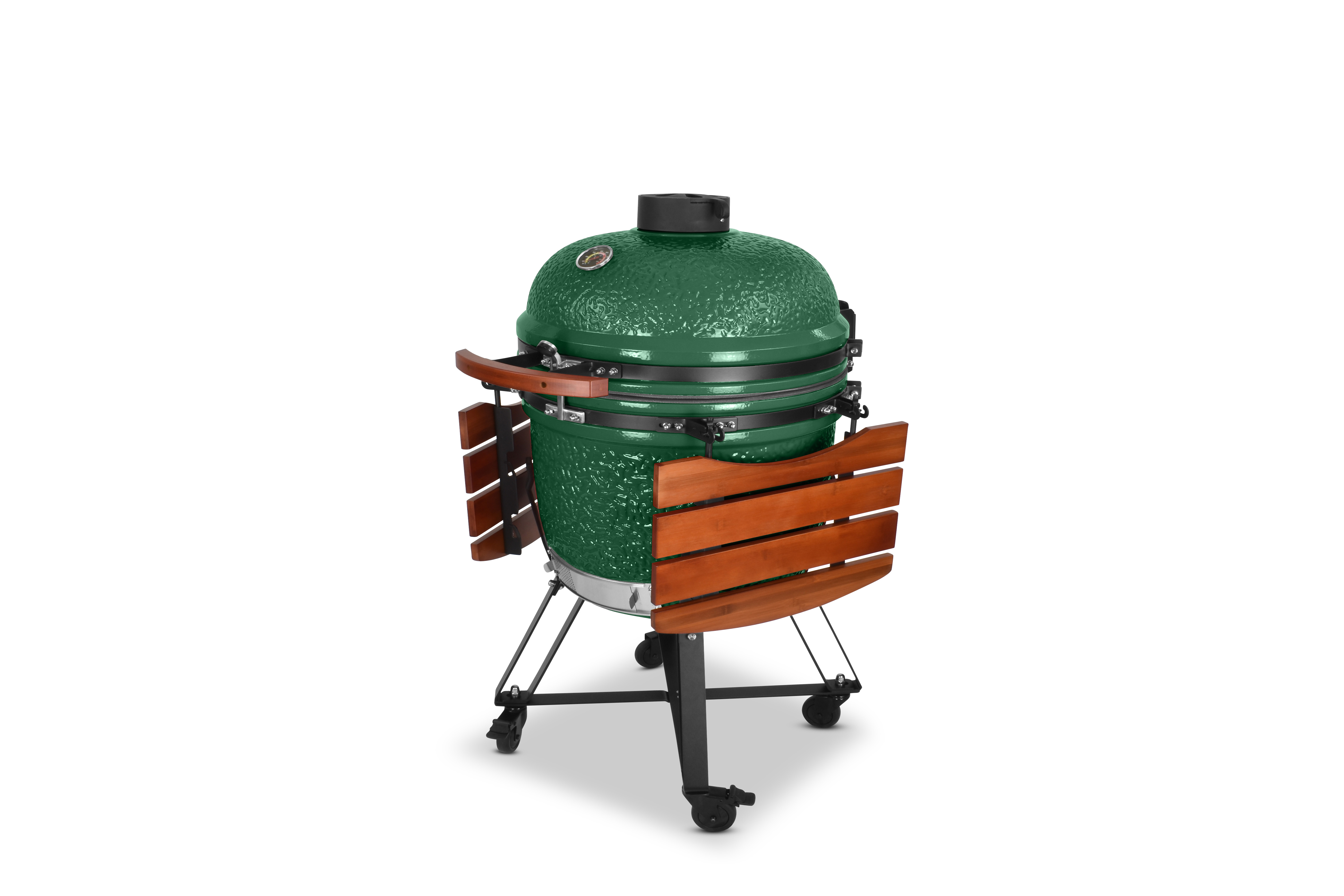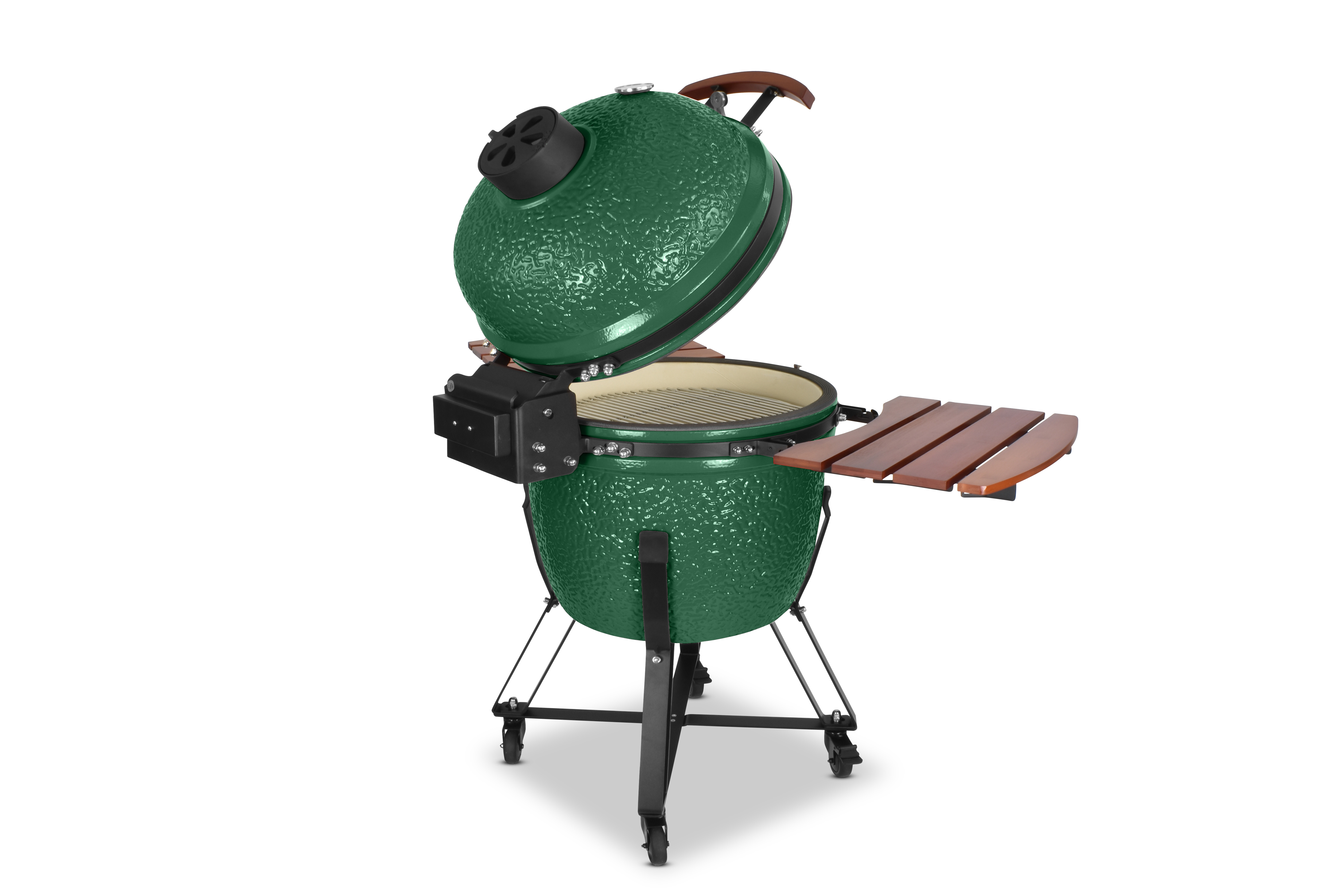 Damit es Ihnen an nichts fehlt, wird der Grill mit einem umfangreichen Zubehörpaket geliefert: Zwei einklappbare Ablagen aus Bambusholz links und rechts neben dem Grilldom bieten genügend Ablagefläche, damit sie immer wissen, wo Grillgut, Besteck oder Getränk ihren Platz finden. Sein Gestell bietet dem Kamado nicht nur einen sicheren Stand und hebt ihn in eine angenehme Arbeitshöhe, sondern ist auch mit vier Schwerlastrollen ausgestattet, um ihn mit wenig Mühe zu bewegen. Damit beim Grillen nichts rollt, besitzen zwei der Räder Feststellbremsen.