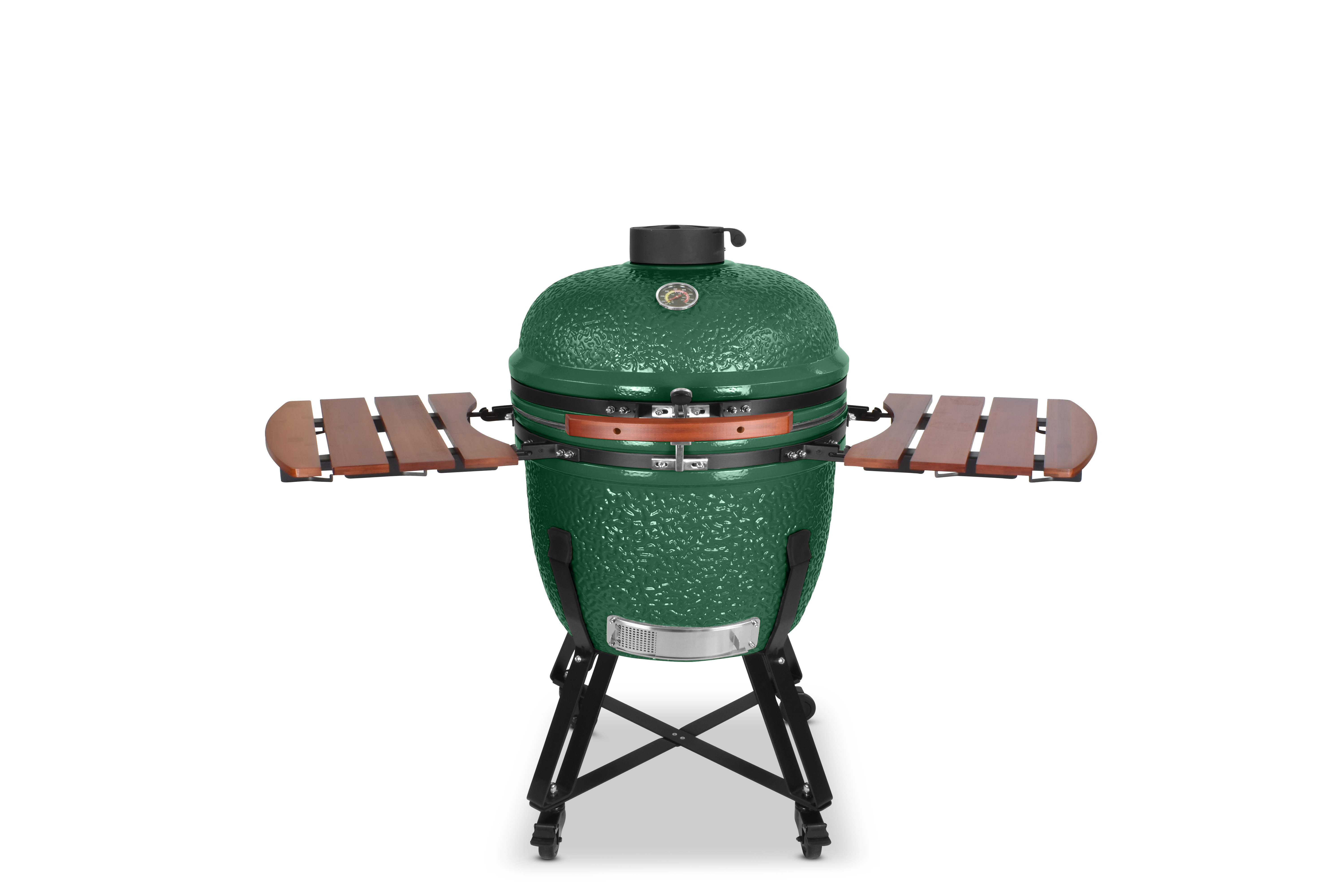 Damit es Ihnen an nichts fehlt, wird der Grill mit einem umfangreichen Zubehörpaket geliefert: Zwei einklappbare Ablagen aus Bambusholz links und rechts neben dem Grilldom bieten genügend Ablagefläche, damit sie immer wissen, wo Grillgut, Besteck oder Getränk ihren Platz finden. Sein Gestell bietet dem Kamado nicht nur einen sicheren Stand und hebt ihn in eine angenehme Arbeitshöhe, sondern ist auch mit vier Schwerlastrollen ausgestattet, um ihn mit wenig Mühe zu bewegen. Damit beim Grillen nichts rollt, besitzen zwei der Räder Feststellbremsen.